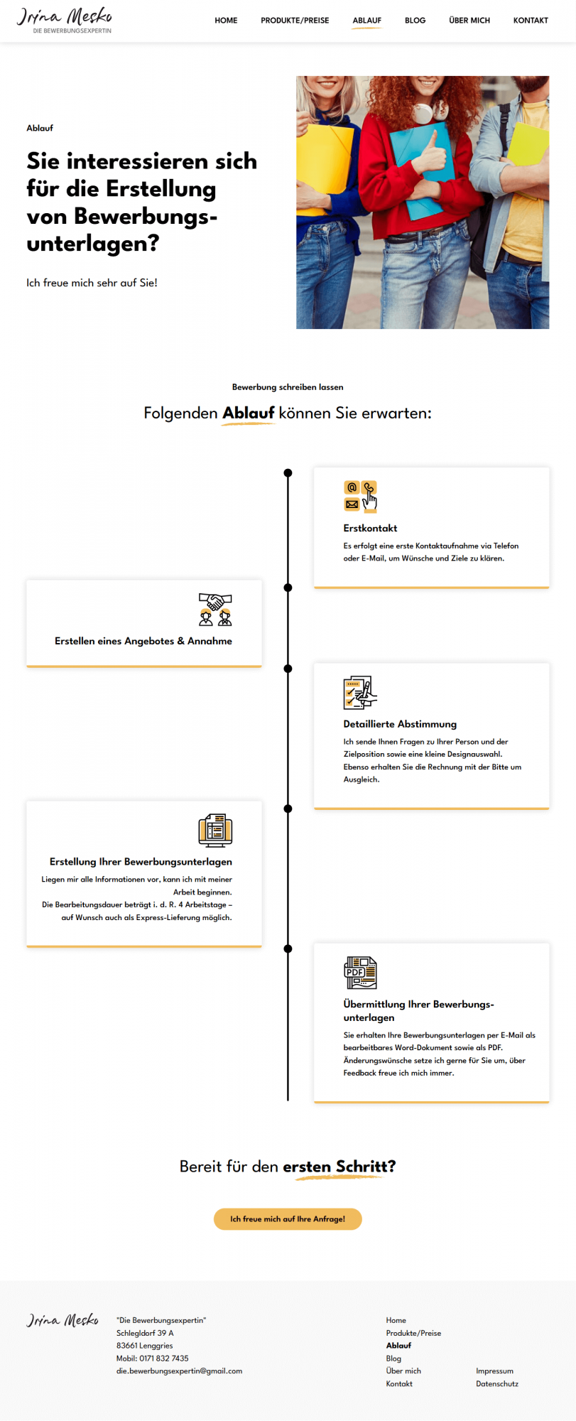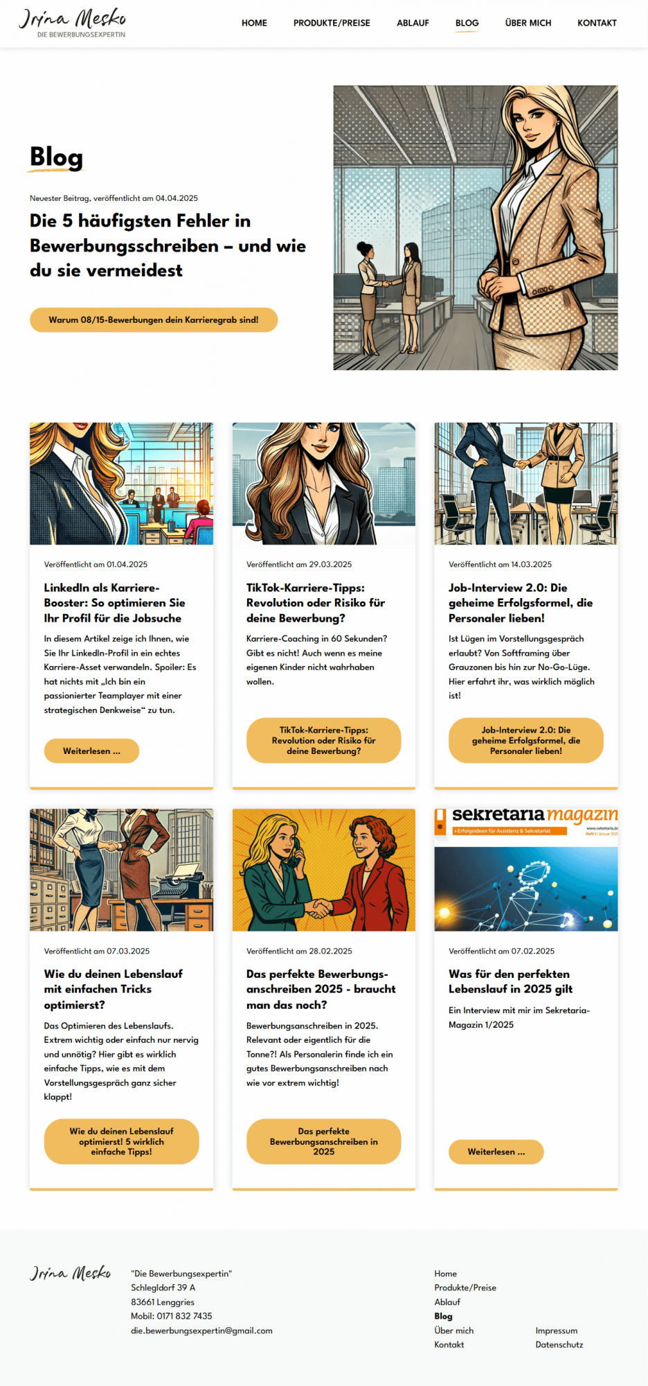 Diese Website bewirbt Bewerbungen: Irina Mesko bietet die Erstellung von professionellen Bewerbungsunterlagen an. Zum Start in ihre Selbständigkeit wurde ich beauftragt, die von der Kundin gelieferte Texte in eine Website zu verwandeln.