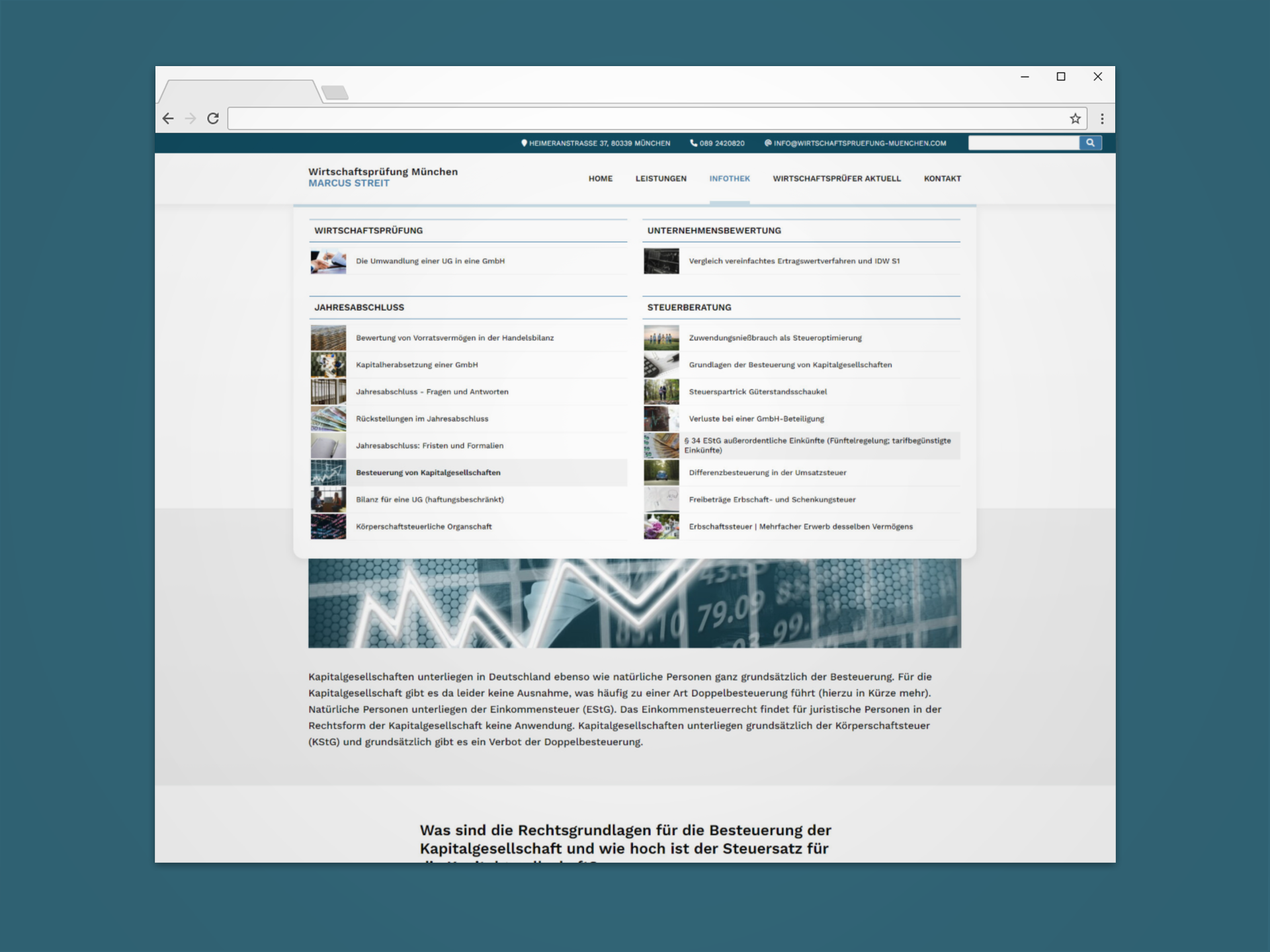 Die eigenständigen Websites für die Leistungsbereiche Steuerberatung und Wirtschaftsprüfung wurden von mir neu designt, in Layout und Aufbau vereinheitlicht, und durch ein Karriereportal für die Steuerberater- und Wirtschaftsprüfungskanzlei ergänzt.